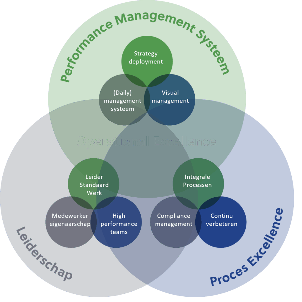 Operational Excellence is geen los project of methode, maar een geïntegreerde manier van werken. Het gaat om het in balans ontwikkelen van drie pijlers: Performance Management, Leiderschap en Proces Excellence.